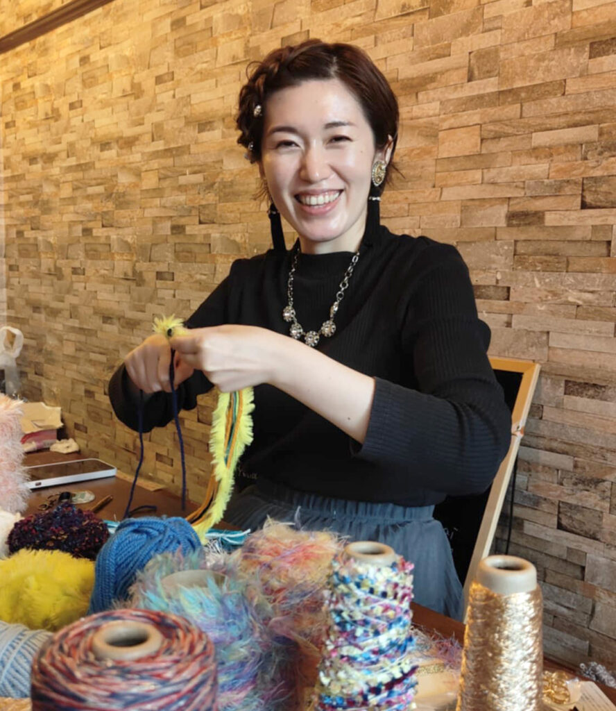 「ワークショップも様々な友人知人から応援していただいて、口コミで広がっていたのですが、ちょうどその頃コロナ禍とも重なってしまいまして、ワークショップをする活動の難しさも感じていた頃でもありまして、そんな中で力を入れたのがライブ配信での活動と作品の受注製作販売でした。冬のシーズンはマフラーの受注製作で忙しかったものの、夏のシーズンどんなことをしようかと思った時に、絵を描くような感覚で、服飾資材を絵の具に見立てて描く、今の活動スタイルに辿り着いたのです。」