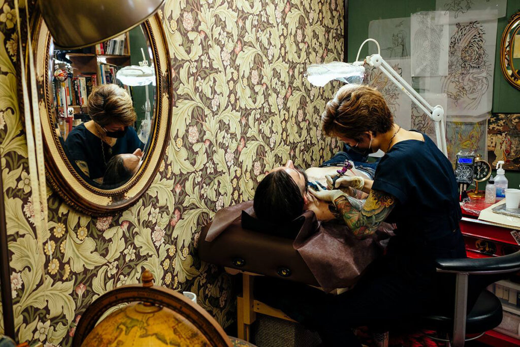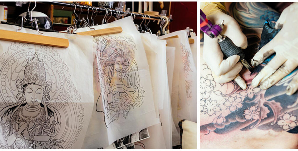 「彫師はお客様の要望や私の知識と合わせながらデザインを作り、肌に針を使って消えない絵をきざんでいきます。身体の場所によっては強い痛みが伴う作業で、時にはお客様を励ましながら、でも主には我慢を強いながら作業しています(笑)」