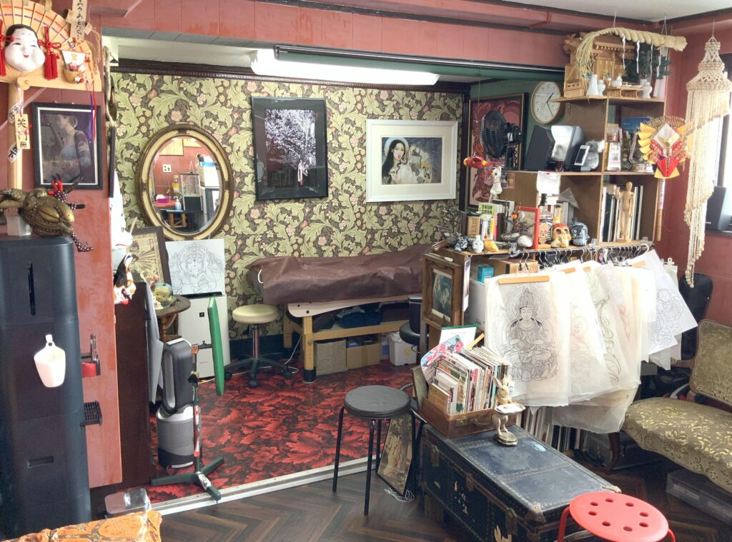 「子供の頃から絵を描くのが好きで、小学生の頃は漫画家になるのが夢でした。大学ではイギリスの大学で舞台美術を専攻し、帰国後は舞台美術へのコネ作りにと思ってCMの撮影スタジオで働いていましたが、頑張って作ったセットが数日で壊されていってしまうのが何だか悲しくて…。見えない相手へ向けて物を作る作業にも違和感を感じていました。相手の顔を見ながら、話しながら、そして長く残る物を作りたいという気持ちが強くなり、当時 興味があった刺青は面白いかも!となったんですね。やるなら伝統のあるスタイル、和彫りを勉強したかったので、和彫りの一門へと弟子入りしました。」